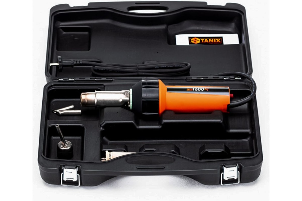 Строительный термофен STANIX EVO 1600ST; Набор насадок; Малая и стальная щетки; Инструкция по эксплуатации; Пластиковый кейс для хранения и транспортировки.
